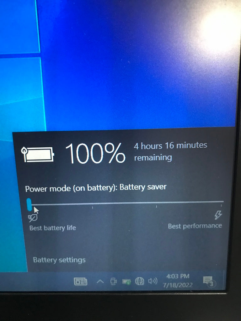 - Laptop Battery : @ 100% charged it indicates 4 hours & 16 minutes