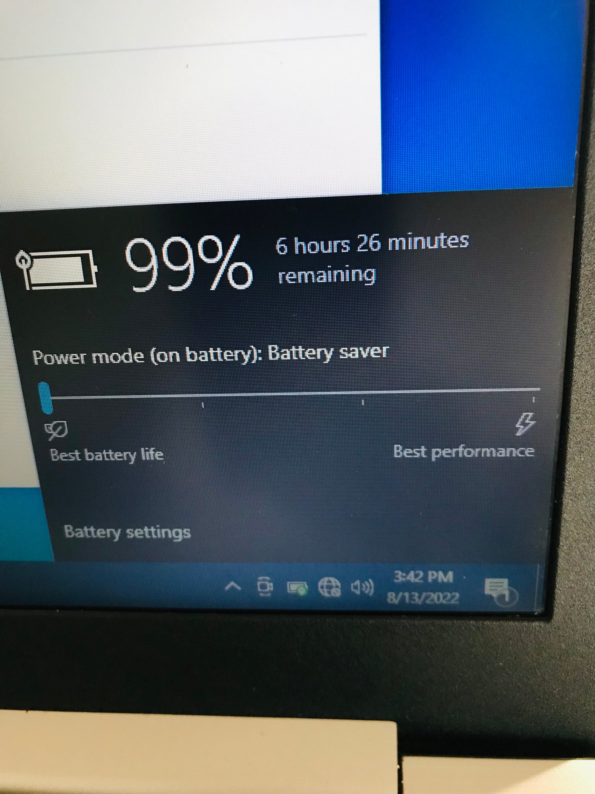 - Battery: when charged to 99% indicates 6 hours & 26 minutes